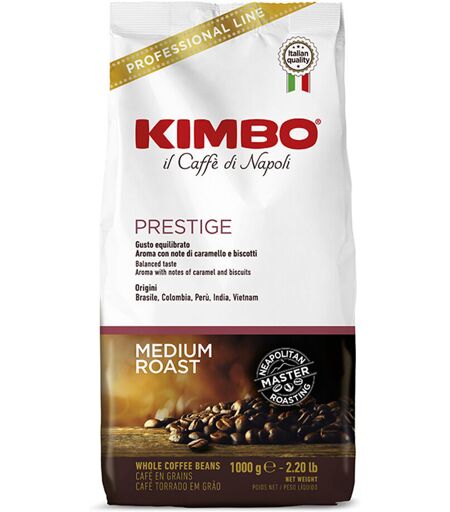 De Kimbo Prestige koffiebonen komen rechtstreeks van de Italiaanse koffiebrander Kimbo uit Napels. Normaal gebruikt Kimbo vooral bonen uit Midden- en Zuid-Amerika, bij deze bonen niet. Deze Prestige Blend bestaat uit bonen van Aziatische en Zuid-Amerikaanse afkomst. Een iets zachtere melange van ...