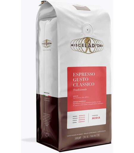 uitgebalanceerd cafeïnegehalte. De Gusto Classico heeft een fascinerende chocoladesmaak met een lang aanhoudende, intense nasmaak. Door zijn sterke smaak kan de Miscela d’Oro Grand d’Aroma ook heel goed worden bereid in combinatie met melk, bijvoorbeeld als cappuccino of latte macchiato. ...
