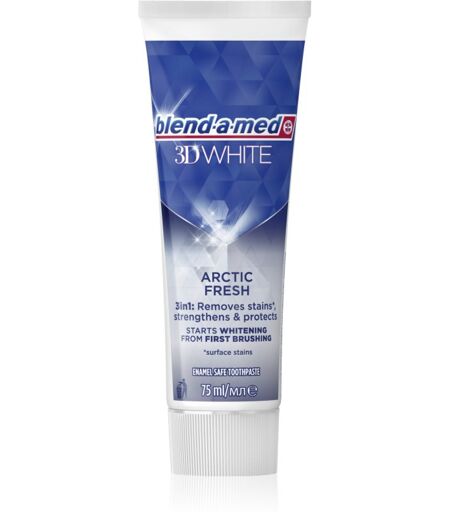 Blend-a-med 3D White Arctic Fresh, 75 ml, Whitening tandpasta Unisex, De tandpasta Blend-a-med 3D White Arctic Fresh is bedoeld voor zacht tanden bleken. Verwijdert effectief ongewenste pigmentatie van de tanden en beloont je bij regelmatig gebruik met een nog stralender glimlach. Kenmerken: bleekt tanden bestrijdt tandbederf en tandplak revitaliseert en verzorgt het tandvlees verwijdert tandsteen en tandplak verfrist de ademhaling schuurt de tanden niet Hoe te gebruiken: Poets je tanden grondig minstens 2 minuten lang. ...