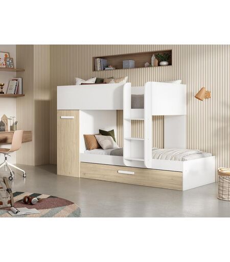 Het bed ANTHONY "alles-in-één" is ideaal om plaats vrij te maken in de kinderkamer. Uw kinderen kunnen hun spullen opbergen in de kast en hun vriendjes uitnodigen om te komen logeren dankzij het uitschuifbed. De structuur met twee kleuren geeft een beetje pep en een verfijnd karakter aan de kamer van uw kinderen, meisjes of jongens! Details Kleur (tint): Wit, Natuurlijk licht Materiaal: Spaanplaat Afwerking: Gemelamineerd Matrasmaat: 90 x 190 cm Aantal plaatsen: 2 plaatsen Omkeerbaar Zonder matras Met bedbodem Type bedbodem: Hardboard bedplaat Soort kast: Kast, Kledingstang Aantal kasten: 1 Productlijn: Good for Planet, Création Exclusive Milieuverantwoordelijkheidscriteria: PEFC®, Gemaakt in Europa Maximale belasting: 75 kg Meubel om zelf in elkaar te zetten : : : Opgelet: het bovenste bed is niet geschikt voor kinderen jonger dan 6 jaar : Afmetingen Lengte: 243 cm Hoogte: 150 cm Diepte: 97 cm Hoogte tussen de bedden: 88 cm Hoogte van het veiligheidshek: 16 cm Levering De levertijd van dit product zal worden bevestigd in de winkelwagen. Wij raden u aan om bij de levering goed het aantal geleverde pakketten te controleren. Pakket Pakket nummer 1: Lengte 197 cm, Breedte 53 cm, Hoogte 6 cm, Gewicht 30 kg, Pakket nummer 2: Lengte 156 cm, Breedte 43 cm, Hoogte 8 cm, Gewicht 22 kg, Pakket nummer 3: Lengte 157 cm, Breedte 99 cm, Hoogte 6 cm, Gewicht 40 kg, Pakket nummer 4: Lengte 200 cm, Breedte 51 cm, Hoogte 8 cm, Gewicht 39 kg, Pakket nummer 5: Lengte 200 cm, Breedte 51 cm, Hoogte 7 cm, Gewicht 40 kg, ...