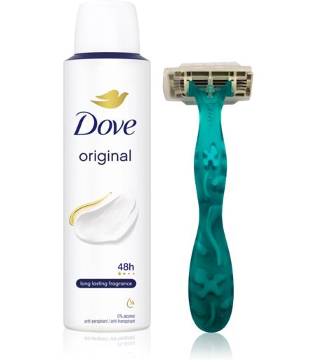 Dove Original, 2 st, Antitranspirant voor Vrouwen , Alles voor een mooie huid in één verpakking. Met de cosmeticaset Dove Original kun je jezelf blij maken of een naaste een plezier doen. Inhoud van de set: Dove Original Antitranspirant Deospray 48h 150 ml Razor Scheerapparaat 1 st Kenmerken: beschermt tegen vervelende geur geeft frisheid biedt langdurige bescherming laat geen vlekken achter op de kleding scheert snel en gemakkelijk past zich aan de plooien van het lichaam aan scheert oksels, benen en intieme gebieden doet elke vrouw plezier Hoe te gebruiken: Gebruik elk product uit de cosmeticaset volgens de gebruiksaanwijzing. ...