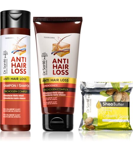 Dr. Santé Anti Hair Loss, 3 st, Cosmetische sets voor Vrouwen , Alles voor een mooie huid in één verpakking. De cosmeticaset Dr. Santé Anti Hair Loss bevat niet één, maar meerdere producten om je dagelijkse cosmetische routine te creëren of verrijken. Doe jezelf of je dierbaren er plezier mee als cadeautje. Inhoud van de set: Dr. Santé Anti Hair Loss - Conditioner hair growth stimulation Conditioner voor Ondersteuning van Haargroei 200 ml Dr. Santé Anti Hair Loss - Shampoo hair growth stimulation Shampoo voor Ondersteuning van Haargroei 250 ml reinigende baardzeep voor het Gezicht 100 g Kenmerken: wast het haar en reinigt de hoofdhuid stimuleert de haargroei sluit het oppervlak van de haren en maakt het resistenter verbetert de haarstructuur een set voor een voordelige prijs Hoe te gebruiken: Gebruik elk product uit de cosmeticaset volgens de gebruiksaanwijzing. ...