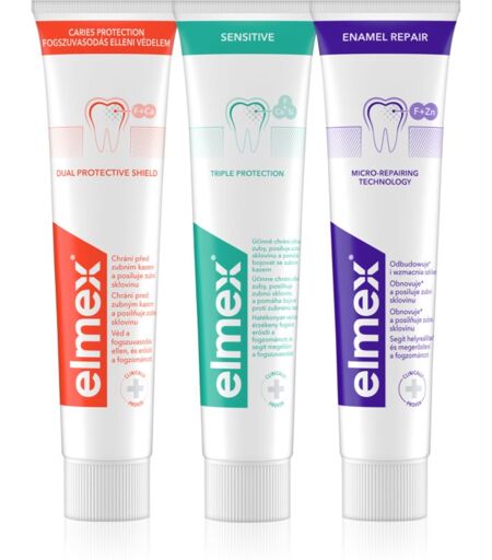 Elmex Mix Trio, 3x75 ml, Complete bescherming Unisex, De tandpasta Elmex Mix Trio verzorgt volledig je tanden en tandvlees en laat een aangename frisse adem achter. Inhoud van de set: Elmex Caries Protection Anti Caries Tandpasta met Fluoride 75 ml Elmex Repair Enamel Repair Tandpasta 75 ml Elmex Sensitive Pasta voor Gevoelige Tanden 75 ml Kenmerken: bleekt tanden verfrist de ademhaling garandeert zachtheid voor het tandglazuur voorkomt het vastzetten van tandsteen vermindert de gevoeligheid van de tanden reinigt op betrouwbare wijze de tanden Hoe te gebruiken: Gebruik minimaal 2 keer per dag. ...