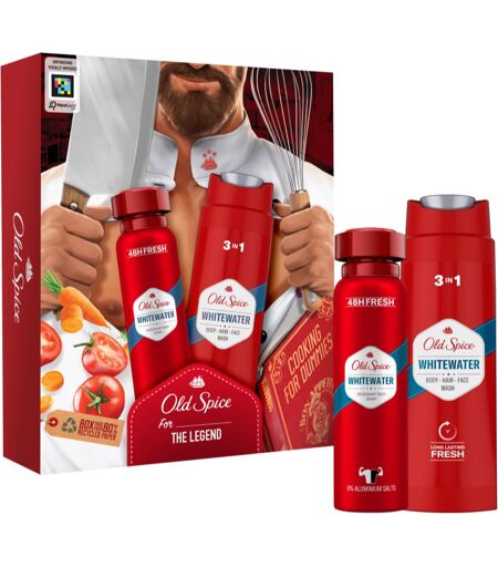 Old Spice Whitewater New Chef, , Lichaamsverzorgingssets voor mannen voor Mannen, Het preparaat Old Spice Whitewater New Chef is een essentiële hulp voor elke dag in de strijd tegen transpiratie. Inhoud van de set: Old Spice Whitewater Douchegel 250 ml Old Spice Whitewater Deodorant Spray 150 ml Hoe te gebruiken: Gebruik elk product uit de cosmeticaset volgens de gebruiksaanwijzing. ...