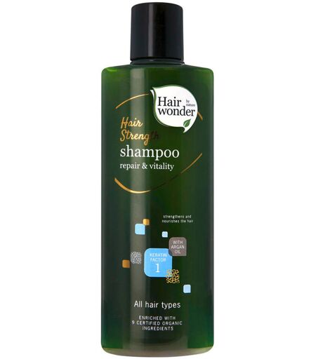 Luxueuze en geconcentreerde, mild reinigende shampoo voor alle haartypes. Actieve keratine versterkt het haar en verbetert de conditie. Biologische arganolie en provitamine B5 voeden, beschermen en geven het haar een natuurlijke glans. Verrijkt met 9 gecertificeerde biologische ingrediënten. Hoe te gebruiken: Wassen en uitspoelen. Tip: Gebruik in combinatie met Hairwonder Hair Strength Conditioner. ...