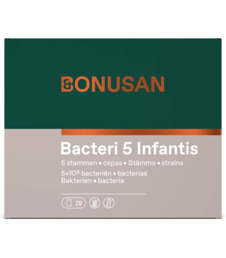 Meer informatie over Bonusan Bacteri 5 infantis Bacteri 5 Infantis biedt een toegankelijke mix van 5 lactobacillusstammen speciaal geselecteerd voor baby's en jonge kinderen. Uit onderzoek blijkt dat deze stammen veilig zijn. De sachets zijn ook te gebruiken tijdens je zwangerschap of als je borstvoeding geeft. Lactobacillen zijn de eerste bacteriën waar de baby mee in aanraking komt tijdens de bevalling. Dit supplement is ideaal om extra lactobacillen mee toe te dienen. Het poeder heeft een neutrale lichtzoete smaak, lost makkelijk op in water, babyvoeding en afgekolfde moedermelk. Bacteri 5 Infantis is vrij van zoet- of smaakstoffen en is volledig suikervrij en lactosevrij. Het kan daarom al direct na de geboorte gegeven worden in bijvoorbeeld een flesje (afgekolfde) melk. De stammen in Bacteri 5 Infantis zijn geschikt voor baby’s en jonge kinderen, want ze zijn veelvuldig getest en onderzocht in wetenschappelijk onderzoek. Lactobacillen zijn de eerste stammen waar de baby mee in contact komt tijdens de geboorte. Na enkele dagen worden de lactobacillen vergezeld door bifidobacteriën, waarna bifidobacteriën de overhand gaan nemen. Het gebruik van probiotica bij baby’s en jonge kinderen is volkomen veilig. Zelfs in die eerste speciale dagen na de geboorte. Neem dan altijd alleen een supplement dat enkel probiotica bevat en verder geen toevoegingen. Samenstelling per dagdosering van 1 sachet Mix van bacteriestammen: Lb. reuteri LR92, Lb. rhamnosus LR1, Lc. lactis SP38, Bb. lactis BLC1, Bb. longum ssp. infantis BI221 3 x 10⁹ KVE Inuline 250 mg Ingredienten Maltodextrine, inuline, mix van bacteriestammen. Gebruik Tenzij anders aanbevolen de inhoud van een sachet mengen met lauwwarm water (niet warmer dan 37 °C), afgekolfde moedermelk of vruchtensap (vanaf 8 maanden), kort doorroeren of schudden en toedienen. Aanbevolen dosering niet overschrijden. Droog en afgesloten bewaren bij kamertemperatuur. Fabrikant Bonusan Postbus 7212 3280 AA Numansdorp Disclaimer • Aanbevolen dosering niet overschrijden. Een voedingssupplement kan een evenwichtige voeding en een gezonde leefstijl niet vervangen. Buiten bereik van jonge kinderen houden. Raadpleeg vóór gebruik een deskundige in geval van zwangerschap, borstvoeding, ziekte of medicijngebruik. ...