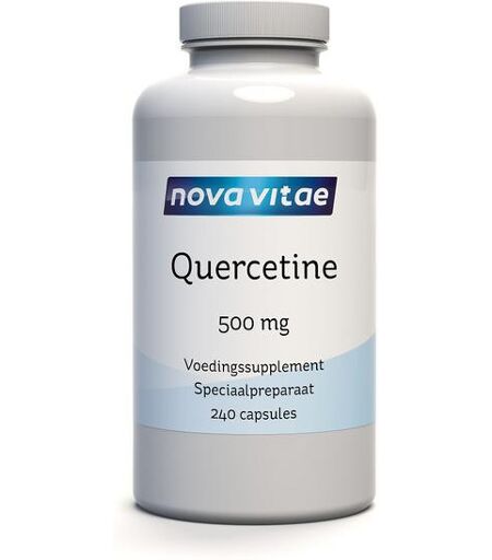 Nova Vitae Quercetine 500mg Kruidenpreparaat Ontdek de kracht van Quercetine! Deze bijzondere bioflavonoïde, te vinden in citrusvruchten, uien, aardappelen en boekweit, staat ook bekend als vitamine P. Maar wist je dat tijdens het koken 70 tot wel 90 procent van de quercetine uit onze voeding verdwijnt? En van wat overblijft, wordt slechts een deel efficiënt opgenomen door ons lichaam vanwege de binding met andere fytonutriënten. Om ervoor te zorgen dat je optimaal profiteert van de voordelen van quercetine, kan een supplement een slimme keuze zijn. Verrijk je dagelijkse routine met de kracht van Quercetine! Waar wordt Quercetine uit gewonnen? Quercetine is een natuurlijk voorkomende flavonoïde die in diverse planten en voedingsmiddelen voorkomt. Het kan worden geïsoleerd en gewonnen uit verschillende bronnen: Uien: Dit is een van de rijkste bronnen van quercetine. Zowel de rode als de gele uien bevatten hoge concentraties van deze stof. Appels: Vooral de schil van appels is rijk aan quercetine. Bessen: Verschillende soorten bessen, zoals bosbessen en zwarte bessen, bevatten ook quercetine. Bladgroenten: Sommige bladgroenten, zoals boerenkool en spinazie, bevatten quercetine. Broccoli: Deze groente is een andere goede bron van quercetine. Kappertjes: Deze bevatten een aanzienlijke hoeveelheid quercetine. Thee: Zowel groene als zwarte thee kan quercetine bevatten. Ginkgo biloba: Het extract van deze plant bevat vaak quercetine. Citrusvruchten: Hoewel ze in kleinere hoeveelheden aanwezig zijn in vergelijking met uien of appels, bevatten citrusvruchten zoals grapefruits en sinaasappels ook quercetine. Olijfolie: Quercetine kan ook worden gevonden in extra vierge olijfolie. Voor commerciële extractie en productie van quercetine-supplementen worden vaak deze natuurlijke bronnen gebruikt, waarbij uien vaak een van de meest gebruikte bronnen zijn vanwege hun hoge gehalte aan quercetine. Dit product is gegarandeerd vrij van melk, ei, pinda’s, noten, vis en schaaldieren, soja, tarwe, gluten of gist en geschikt voor vegetariërs en veganisten. Samenstelling per maximale dagdosering van 3 capsules Quercetine (QU995*) 1500 mg * QU995 is de meest zuivere en best opneembare onbewerkte vorm van Quercetine. Ingredienten Quercetine, rijstmeel en cellulose (plantaardige capsule). Gebruik Voor optimale resultaten adviseren wij om één tot driemaal per dag 1 capsule in te nemen met een glas water, bij voorkeur tijdens een maaltijd. Vergeet niet altijd het advies van een zorgprofessional op te volgen voordat je met een nieuw supplement begint. Koel, donker, droog en buiten bereik van kinderen bewaren. Fabrikant Nova Vitae BV Elleboog 1 6713 KP Ede Dit product is een voedingssupplement. Aanbevolen dosering niet overschrijden. Een gevarieerde, evenwichtige voeding en een gezonde levensstijl zijn belangrijk. Een voedingssupplement is geen vervanging van een gevarieerde voeding. Buiten bereik van jonge kinderen houden. Droog, afgesloten en bij kamertemperatuur bewaren,... ...