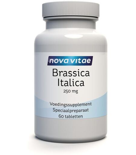 Brassica Italica is de Latijnse naam voor broccoli. Het is bekend, door wetenschappelijke studies, dat kruisbloemige groentes zoals broccoli, spruitjes, kool en bloemkool goed is voor uw gezondheid. Dit komt niet alleen door de veelheid van vezels en vitamines maar voornamelijk door de stof sulforafaan. Door het koken van broccoli gaan helaas veel van deze stoffen verloren. Onderzoekers hebben het hoofdbestanddeel van broccoli genaamd sulforafaan geïsoleerd, en geconstateerd dat deze stof veel beschermende eigenschappen bevat. Er wordt aangenomen dat Sulforafaan, een isothiocyanaat, enzymen in het lichaam stimuleert. Vers ontkiemde broccoli spruiten bevatten 30 tot 50 keer de concentratie isothiocyanaten als rijpe broccoli. Brassica Italica van Nova Vitae is gemaakt van vers ontkiemde broccoli spruiten en bevatten een gestandaardiseerde hoeveelheid van 2000 mcg sulforafaan per dagdosering, wat gelijk staat aan het eten van meer dan een pond verse broccoli per dag. Brassica Italica van Nova Vitae is geschikt voor vegetariërs en is hypoallergeen: bevat geen gist, zuivel, eieren, gluten, maïs, soja of tarwe. Dit product is vrij van suiker, zetmeel, zout, conserveermiddelen of kunstmatige kleur-, geur-, of smaakstoffen. Elke dagdosering van 2 tabletten bevat: Brassica italica 500 mg (gestandaardiseerd op 2000 mcg sulforafaan) Calcium (citraat) 354 mg (Referentie inname 35%) Ingredienten: Brassica italica (gestandaardiseerd broccoli extract), calcium (citraat), stearinezuur, hydroxypropylcellulose, microkristallijne cellulose, silica, (Non GMO) gemodificeerde cellulose gom. Gebruik: Volwassenen nemen dagelijks 2 tabletten bij voorkeur bij de maaltijd met wat water in tenzij anders geadviseerd. Koel en droog bewaren. Fabrikant: Nova Vitae Elleboog 1 6713 KP, Ede Dit product is een voedingssupplement. Aanbevolen dosering niet overschrijden. Een gevarieerde, evenwichtige voeding en een gezonde levensstijl zijn belangrijk. Een voedingssupplement is geen vervanging van een gevarieerde voeding. Buiten bereik van jonge kinderen houden. Droog, afgesloten en bij kamertemperatuur bewaren, tenzij anders geadviseerd op het etiket. Raadpleeg een deskundige alvorens supplementen te gebruiken in geval van zwangerschap, lactatie, medicijngebruik en ziekte. ...