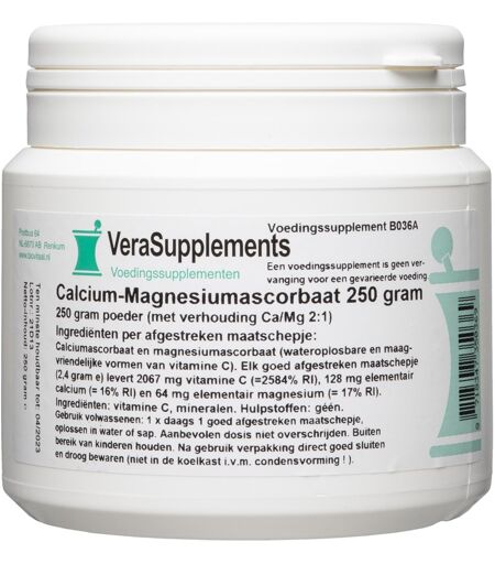 VeraSupplements Calcium-Magnesiumascorbaat Poeder bevat een niet-zure, maagvriendelijke vorm van vitamine C en is bron van calcium en magnesium (elementair 2:1 Ca/Mg). VeraSupplements Calcium-Magnesiumascorbaat Poeder:Bevat een maagvriendelijke vorm van vitamine C die bijdraagt aan de bescherming ...