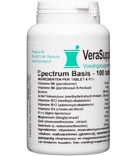 De VeraSupplements Spectrum Basis Tabletten bevatten een breed complex van verschillende belangrijke vitaminen, mineralen en enzymen. Hierdoor hebben ze een brede werking op het lichaam en dragen ze onder meer bij tot een normale werking van het zenuwstelsel en een normale psychische functie. ...