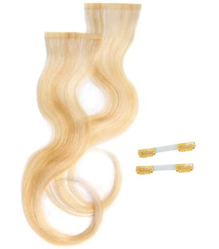 Het Achter-de-schermen Geheim. Een product van menselijk haar dat gemakkelijk in uw eigen haar wordt gelijmd. Het kan dus 4 tot 6 weken in het haar blijven. Met de clipstrip kunnen tape-extensions snel in het haar worden geklikt. Tape Extensions zijn voorgegradueerd, gemaakt van 100% menselijk haar en zijn herbruikbaar. Inhoud: 2 Tape Extensions, 2 Applicatie Tapes, 2 Clip-Strips. Haarlengte 40 cm100 % menselijk haar2 Stroken van ca. 7 cm breed herbruikbare lijm of clipgetrapt voor een perfecte integratiegeen schade aan het haar6 maanden garantiesnelle verandering van het uiterlijk ...