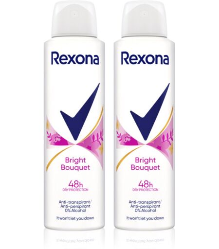 Rexona Bright Bouquet, 2x150 ml, Antitranspirant voor Vrouwen , De antiperspirant Rexona Bright Bouquet absorbeert optimaal zweet en neutraliseert geur. Geeft je elke dag een fris en schoon gevoel. Inhoud van de set: Rexona Sexy Bouquet Antitranspirant Spray 48h 150 ml Kenmerken: beschermt effectief tegen transpiratie beschermt tegen vervelende geur laat een langdurig gevoel van frisheid achter een set voor een voordelige prijs Hoe te gebruiken: Breng aan op een schone en droge huid onder de armen. Laat het volledig drogen voordat je je aankleedt. Je kunt het op elk moment van de dag herhalen. ...
