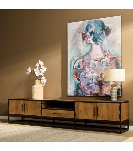 Industriëel TV meubel met twee deuren, lade en audio ruimte. Het meubel is gemaakt van massief mangohout gecombineerd met metalen accenten. Combineer dit tv meubel met de overige meubelen uit deze serie!Dit artikel is handgemaakt, iedere meubel is uniek. Onregelmatigheden in het hout en metaal in vorm en kleur dragen bij aan het individuele karakter.Afmetingen:Breedte: 240 cmDiepte: 45 cmHoogte: 50 cmKleurcombinatie:ombouw & fronten naturel mangohoutmetalen frames & accenten... ...