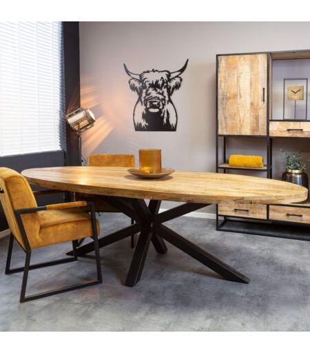 De Ovale eettafel mango 300 cm is een moderne ovale mangohouten eettafel met robuust 6 cm tafelblad en gecombineerd met metalen matrix onderstel. Gezellige sfeervolle tafel met functioneel matrix onderstel waardoor er veel ruimte is om stoelen te plaatsen.Kenmerken: Biedt plaats aan ca 12 personenStoere look door het ruwe mangohoutNatuurlijke houtvormen en kleurpatronen zichtbaarTafelblad 6 cm (3 cm massief + 3 cm opgedikt) Afmetingen tafelpoten 8 x 4 cmDeze eettafel heeft de ca.... ...