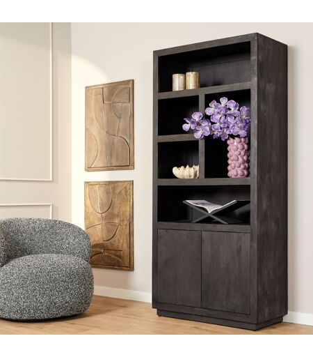 Moderne strak vormgegeven vakkenkast van zwart mangohout. De kast is afgewerkt met een stijlvolle black finish. Mooie decoratieve opbergkast door de open verspringende schappen en de twee dichte deuren. De deuren zijn voorzien van push-to-open sluitsysteem.Combineer deze kast met de andere meubelen uit dit woonprogramma!Afmeting BxDxH: 90 x 45 x 200 cmKleur: zwartMaterialen: massief mango hout ...