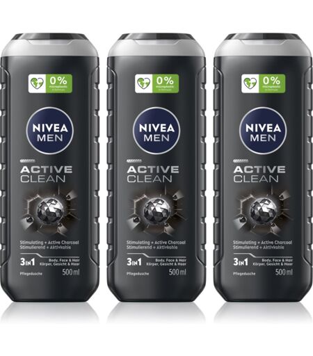 NIVEA MEN Active Clean, , Lichaamsverzorgingssets voor mannen voor Mannen, De douchegel gel NIVEA MEN Active Clean maakt van de dagelijkse noodzaak van hygiëne een unieke verfrissende ervaring. Inhoud van de set: 3x Douchegel voor Mannen 500 ml Kenmerken: reinigt zachtjes de huid van het hele lichaam geeft na gebruik energie en een gevoel van frisheid een set voor een voordelige prijs Hoe te gebruiken: Breng het product aan op een vochtige huid en spoel al het vuil weg. Grondig spoelen. ...