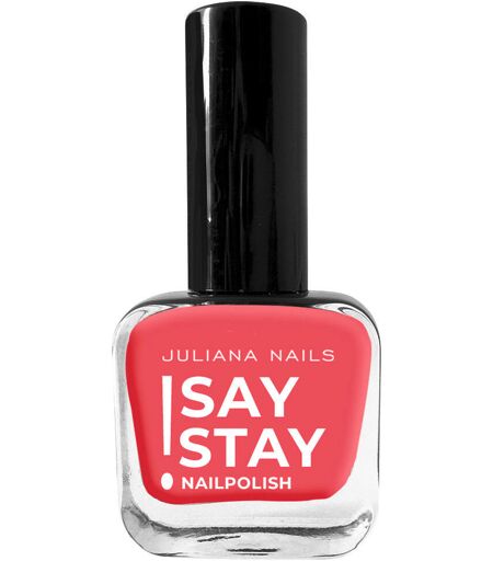 STAY, STAY, STAY - uw wens is het bevel van deze nagellak! De exclusieve formule van Say Stay! nagellak zorgt voor een uitzonderlijk langdurig effect op uw nagels. De aangename, dekkende textuur en het zachte, natuurlijk afgeronde kwastje vereenvoudigen het aanbrengen en zorgen voor een vlekkeloos en vooral streeploos resultaat. Exclusieve formuleExtra lang houdbaarAangename droogtijdStreeploos aanbrengenHoge kleurbriljantieUitstekende pigmentatieZacht penseel met natuurlijke rondingGeen verkleuring van de natuurlijke nagelsMoeiteloos te verwijderen met nagellakremover Say Stay! Deze claim nemen we met onze nagellakken meer dan serieus, want de Say Stay! nagellak is zeker gekomen om te blijven! De exclusieve formule van Say Stay! nagellak zal je verblijden met zijn uitzonderlijk lange houdbaarheid op je nagels. Gemakkelijk aan te brengen! De aangename, zeer dekkende textuur en het zachte, natuurlijk afgeronde kwastje maken het aanbrengen gemakkelijk en zorgen voor een vlekkeloos en vooral streeploos resultaat. Vervelende strepen en lelijke nagelranden behoren tot het verleden! Met onze nagellakremover (zonder aceton) verwijder je de lak moeiteloos. Kleuren in overvloed! Fel, subtiel, licht of donker, Juliana Nails heeft voor elke stemming en elke smaak de juiste kleur. Maar dat is nog niet alles. Bij Juliana Nails kunt u ook de juiste base coat of top coat voor u kiezen uit talrijke behandelingen. Of het nu gaat om een gladmakende groefvuller of een sneldrogende topcoat - iedereen vindt hier wat hij zoekt. Laat je overtuigen door de lange houdbaarheid van deze nagellakkleuren en blijf gewoon STAY, STAY, STAY zeggen - jouw wens is het bevel van deze nagellakkleuren! De kleuren kunnen enigszins afwijken van de ware kleur, afhankelijk van de scherm- of weergavekwaliteit. HOE TE GEBRUIKEN: 1. was je handen. (zonder zeep) 2. Vijl uw natuurlijke nagels in vorm. 3. Stof uw natuurlijke nagels af met een nagelborstel. Breng een zeer dunne laag van de gewenste base coat aan. 5. 5. Laat 1-2 minuten aan de lucht drogen (verschilt per product). 6. Nu kun je de door jou gekozen nagellakkleur aanbrengen. Zorg ervoor dat je een dunne laag nagellak aanbrengt die de punt van de nagel bedekt. 7. Laat deze laag 2-3 minuten aan de lucht drogen. (De droogtijd kan geminimaliseerd worden door de nagellak spaarzaam aan te brengen). 8. Herhaal de laatste twee stappen indien nodig. 9. Breng ter verzegeling een topcoat naar keuze aan. Nogmaals, zorg ervoor dat je de tip van je nagel voorzichtig bedekt en volledig laat drogen. Een kleine tip: verzorg je nagels daarna met een van onze nagelriemoliën. De kleuren De Say Stay! Nail Polish - Drinks On Me is een zachte lila-taupe tint. Dekking: medium De Say Stay! Nail Polish - Feeling Blue is een pastel baby blauw. Dekking: medium De Say Stay! Nail Polish - Happy Mind is een koel pastel roze met paarse ondertonen. Dekking: medium-hoog De Say Stay! Nail Polish - Remember Me is een intens, donkerder bessenpaars. Dekking: hoge... ...