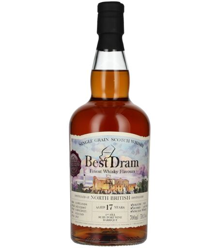 The Best Dram 17 Years Old North British Single Grain Scotch Whisky is een fascinerende single cask botteling die op indrukwekkende wijze het volledige potentieel van een gerijpte single grain whisky laat zien. Gedistilleerd in 2007 in de gerenommeer Kleur: Donker robijn met een roodbruine glans. Neus: Intens fruitig met rijpe wilde bessen, gestoofde pruimen, portwijn, rozenhout, karamel en een fijne kruidige toets. Smaak: Vol, zoet en krachtig met aroma's van druivengelei, gelei van rode vruch ...
