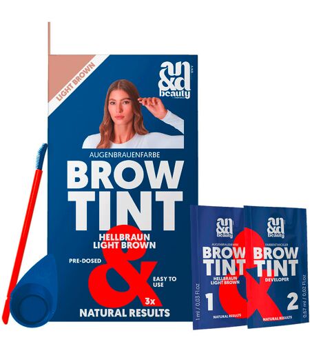 Meer expressie voor je wenkbrauwen - zonder dagelijkse inspanning. Deze wenkbrauw tint sets bevatten 3 x zakje Tint3 x zakje Ontwikkelaar1 x borsteltje1 x bakje De A.N.D. beauty Brow Tints geven je wenkbrauwen zichtbaar meer diepte, kleur en definitie in slechts een paar minuten. De crèmige formule is eenvoudig vooraf af te meten, gemakkelijk aan te brengen, blijft tot 4 weken zitten en past bij alle haartypes en huidtinten. 4 supernatuurlijke tinten - zonder roodzweem: donkerblond / lichtbruin / donkerbruin / zwart. Toepassing: Meng kleurcrème en ontwikkelaar. Breng aan op gereinigde wenkbrauwen. 5-10 minuten laten inwerken. Verwijder met een vochtig wattenschijfje. ...