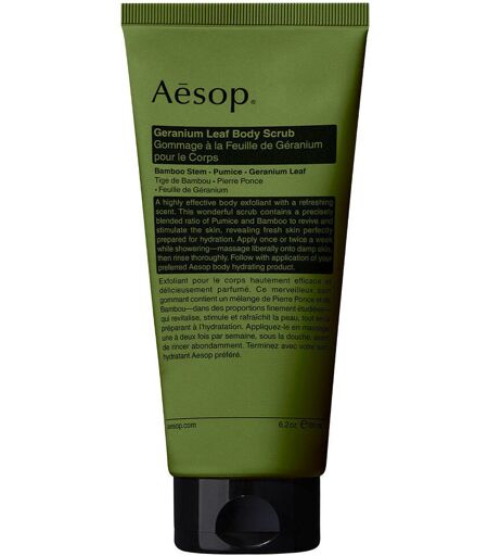 De Geranium Leaf Body Scrub bevat twee soorten gemalen puimsteen en gemicroniseerde bamboestengels om te scrubben, terwijl geraniumbladolie de huid verzacht en kalmeert. Mandarijn- en bergamotolie zijn ook toegevoegd voor hun reinigende en ontsmettende eigenschappen. Geur: Groen, citrusachtig, fris Gebruik: Breng een kleine hoeveelheid van de scrub aan op een vochtige huid en masseer het lichaam met zachte, ronddraaiende bewegingen. Laat de bamboestengels en puimsteen zachtjes scrubben met minimale druk. Goed afspoelen. Aesop Aesop werd in 1987 opgericht in Melbourne en heeft sindsdien producten ontwikkeld die prioriteit geven aan doeltreffendheid - hun complexe, kenmerkende geuren zijn slechts een extra traktatie. Vandaag de dag omvat het assortiment huid-, haar- en lichaamsverzorgingsproducten, maar ook geuren en accessoires voor jou en je huis. Sommige van de gebruikte ingrediënten zijn afkomstig van planten, andere zijn afkomstig uit laboratoria; ze zijn allemaal ethisch verantwoord en veilig bevonden. Aesop - een Certified B Corporation™ - test haar formules en ingrediënten niet op dieren. Alle Aesop producten zijn veganistisch, gecertificeerd door de Leaping Bunny en opgenomen in PETA's lijst van wreedheid-vrije en veganistische producten. ...