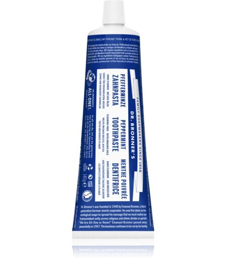Dr. Bronner’s Peppermint, 105 ml, Zonder fluoride Unisex, De tandpasta Dr. Bronner’s Peppermint bevat geen fluoriden en versterkt de tanden op natuurlijke wijze. De tandpasta is vooral geschikt voor gevoelige tanden en tandvlees. Kenmerken: bestrijdt tandbederf en tandplak bleekt tanden verfrist de ademhaling Ingrediënten: bevat geen fluoriden Hoe te gebruiken: Gebruik minimaal 2 keer per dag. Poets je tanden grondig minstens 2 minuten lang. Gebruik voor de eindschoonmaak van je tanden flosdraad of een interdentaal borsteltje. ...