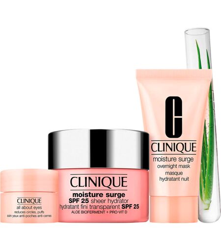 Blijf gehydrateerd - en beschermd - met drie huidverzorgingsfavorieten: een SPF vochtinbrengende ochtendcrème, een diep hydraterend nachtmasker en een oogcrème. Deze set bevat: Moisture Surge SPF 25 Sheer Hydrator 50 mlMoisture Surge Overnachtingsmasker 30 mlAlles over de ogen 5 ml Moisture Surge™ SPF 25 Sheer Hydrator is een lichtgewicht, crèmige moisturiser die hydrateert en tegelijkertijd pure zonbescherming biedt - zelfs voor donkere huidtinten. Beschermt tegen UVA- en UVB-stralen en voorkomt dat de glans van de zon je huid dof maakt. Moisture Surge™ Overnight Mask verzacht en hydrateert de huid terwijl je slaapt voor een dauwachtige, stralende huid als je wakker wordt. All About Eyes™ Cream Gel hydrateert en helpt wallen en donkere kringen te verminderen. Hoe te gebruiken: Moisture Surge SPF25 Sheer Hydrator: de formule ziet er ondoorzichtig uit wanneer je het aanbrengt, zodat je kunt zien waar je het aanbrengt. Begin in het midden en breng aan op de hoogste punten waar de zon het eerst op schijnt. Klop of masseer het product naar buiten toe in zodat het je hele gezicht bedekt.Moisture Surge Overnight Mask: één keer per dag 's avonds aanbrengen. Gebruik het masker na je 3-stappen huidverzorgingsroutine of wanneer je huid een vochtboost nodig heeft. Breng het masker aan op je gezicht en hals of waar je het maar nodig hebt. Vermijd het gebied rondom de ogen.All About Eyes: Gebruik deze dag- en nachtcrème voor de ogen twee keer per dag, 's ochtends en 's avonds. Breng spaarzaam aan op de hele oogzone met je ringvinger en klop zachtjes in. ...