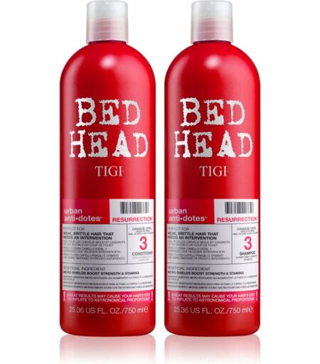 TIGI Bed Head Urban Antidotes Resurrection, 1 st, Cosmetische sets voor Vrouwen , Alles voor prachtig haar in één pakket. De productenset TIGI Bed Head Urban Antidotes Resurrection bevat niet één, maar meerdere producten die helpen bij het creëren of verrijken van een regelmatige haarverzorgingsroutine. Dit pakket vol haarverzorging zal jou, of als cadeau je dierbaren, beslist blij maken. Inhoud van de set: TIGI Bed Head Urban Antidotes Resurrection Conditioner voor Zwak, Gestresset Haar 750 ml TIGI Bed Head Urban Antidotes Resurrection Shampoo voor Futloos en Beschadigd Haar 750 ml Kenmerken: haarverzorging voor prachtig haar dat straalt van energie voor een natuurlijk en gezond aanzicht van het haar Hoe te gebruiken: Gebruik elk product uit de cosmeticaset volgens de gebruiksaanwijzing. ...