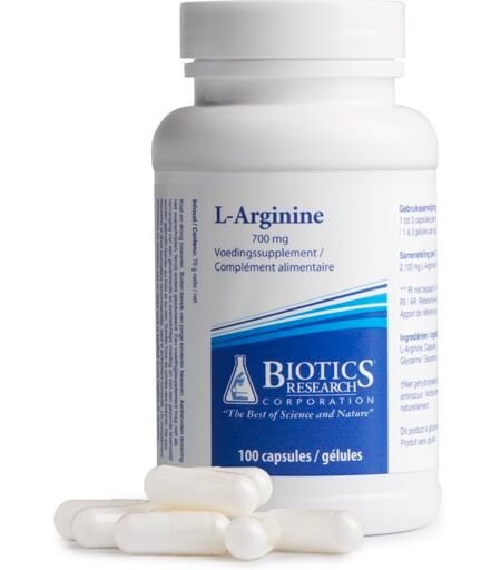 Biotics L-Arginine 700mg Capsules is een voedingssupplement met het semi-essentiële aminozuur L-arginine. Volwassenen maken normaal gesproken voldoende arginine aan uit glutamine, glutaminezuur en proline. Onder bepaalde omstandigheden kan het lichaam niet voldoende L-arginine aanmaken. Biotics ...