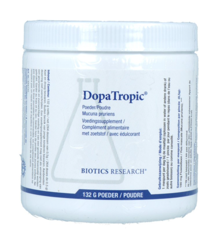 Biotics DopaTropic® Poeder is een voedingssupplement op basis van fluweelboon (Mucuna pruriens) in poedervorm.Dosering1 mespunt per dag bij de maaltijd. Het poeder oplossen in een glas water of andere drank. Dagelijks aanbevolen dosering niet overschrijden. ...