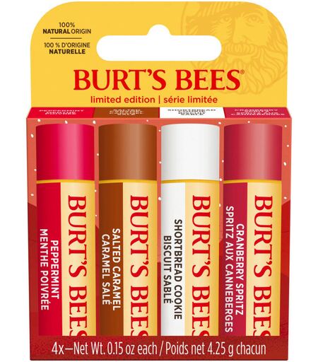 Dit hydraterende Burt's Bees lippenbalsem 4-pack bevat vier heerlijke, feestelijke smaken; Shortbread Cookie, Cranberry Spritz, Salted Caramel & Peppermint. Elke lippenbalsem zit boordevol voedende ingrediënten van 100% natuurlijke oorsprong, verantwoord geproduceerde bijenwas en antioxidantrijke vitamine E om de lippen gevoed, zacht en gehydrateerd te houden. Gebruik: Zo vaak als gewenst royaal aanbrengen. ...