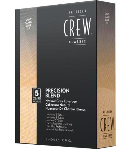 American Crew biedt een overtuigende, tijdbesparende methode voor natuurlijke dekking van grijs haar. Met de Presicion Blend service voor grijs haar voelen klanten zich 5 jaar jonger in slechts 5 minuten. Presicion Blen is geen traditionele kleurenservice. Het grijze haar wordt visueel afgestemd op de natuurlijke haarkleur en de contrasten worden verminderd. Afhankelijk van de kleurschakering, de hoeveelheid kleur en de kleurtechniek varieert de witdekking van 25%,50% tot 75% in het resultaat. Presicion Blend is de ultieme kleurservice voor mannen. Dat is wat Presicion Blend zo speciaal maakt: Slechts 5 minuten toepassingstijdAmmoniakvrijnatuurlijk gevolggeschikt voor hoofdhaar en baardvier koele tintenZorgt voor extra vocht met provitamine B5 Toepassing: Meng in een kleurkom American Crew® Precision Blend en ontwikkelaar (4,5%) in een verhouding van 1:1. Voor een cliënt met 2,5 cm lang haar is een mengsel van 20 ml meestal voldoende. American Crew® kleur ontwikkelt zich in het haar in slechts vijf minuten. Stel de klok in zodra de kleur is aangebracht. Was het haar opnieuw na de vijf minuten om de overtollige kleur uit te spoelen. Droog het haar met een handdoek en werk af met de gewenste styling. Inhoud: 3 x 40 ml. ...