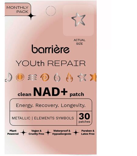 Ervaar de toekomst van dagelijks welzijn met de YOUTH Repair NAD+ transdermale patch - een pilvrije, intraveneuze manier om cellulaire energie, metabolisme en gezond ouder worden te ondersteunen. Met nicotinamide riboside, een klinisch onderzochte NAD+ precursor, levert deze patch constante ondersteuning via de huid gedurende de dag, waarbij de darmen worden omzeild voor efficiënte absorptie. Met slechts twee patches om de dag voel je je energieker, meer gefocust en meer in lijn met je lange termijn vitaliteitsdoelen - zonder naalden of capsules. Samengesteld met 100% plantaardige ingrediënten.Veganistisch en zonder wreedheid.Waterbestendig.Hypoallergeen.Latex- en parabeenvrij. Nicotinamide riboside chloride (NR-chloride) is een vorm van vitamine B3 die fungeert als voorloper van nicotinamide adenine dinucleotide (NAD+). NR-chloride verhoogt effectief de NAD+-niveaus in het lichaam. Verhoogde NAD+ niveaus hebben vele voordelen, waaronder metabolische ondersteuning, anti-veroudering, atletisch herstel, concentratie en een lang leven. Wat is NAD+ en waarom is het zo belangrijk? Denk aan NAD+ (nicotinamide adenine dinucleotide) als de cellulaire "batterij" of energievaluta van je lichaam. Het speelt een belangrijke rol bij de energieproductie in cellen, ondersteunt de stofwisseling, repareert DNA en helpt cellen veerkrachtig te blijven onder stress. NAD+ reguleert ook ontstekingen en helpt telomeren te behouden - beide belangrijke factoren bij gezond ouder worden. Naarmate we ouder worden, daalt ons natuurlijke NAD+-niveau, wat kan leiden tot vermoeidheid, hersenmist, langzamer herstel en zichtbare tekenen van veroudering. Het aanvullen van de NAD+-niveaus wordt een van de meest veelbelovende strategieën voor een lang leven, een gezonde stofwisseling en algehele vitaliteit. Verhoogt cellulaire energie.Bevordert mentale helderheid en focus.Bevordert mentale helderheid en focus.Ondersteunt de spierfunctie en het herstel.Ondersteunt de spierfunctie en het herstel.Ondersteunt DNA-herstel.NAD⁺ Patch levert een constante dosis van dit essentiële co-enzym direct via de huid en ondersteunt gezond ouder worden - natuurlijk en gemakkelijk. Toepassing: Ter voorbereiding: was de handen om ervoor te zorgen dat ze schoon zijn. Haal de pleister van de transparante achterkant. Breng de pleister aan op een schone en droge huid. Draag de pleister gedurende 8-12 uur terwijl de vitamines en adaptogenen vrijkomen via de dermis. barrière Barrière is gecreëerd door oprichters Alexa Adams en Cleo Davis-Urman, voor wie mode een kunst van zelfexpressie is. Hun persoonlijke wellnessreis leidde hen tot het creëren van Barrière - wellnesspleisters die zijn ontworpen om de vitamines te leveren die je misschien mist in een formaat dat je waarschijnlijk nog nooit hebt geprobeerd. De ontwerpen zien er prachtig uit op de huid terwijl ze transdermaal een zeer effectieve mix van vitaminen, voedingsstoffen en adaptogenen afgeven. Elke patch geeft de vitamines transdermaal af via de... ...