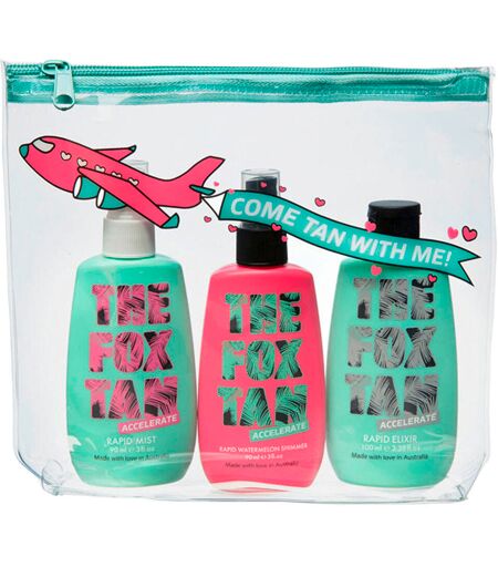 De Jet-Setter Trio is perfect voor een warme, zonovergoten vakantie. Deze bundel bevat al je favorieten van The Fox Tan: 1 x Rapid Tanning Elixir 100 ml1 x Rapid Tanning Mist 90 ml1 x Rapid den Watermelon Shimmer 90 ml Elk flesje bevat het exclusieve FoxComplex® ingrediënt om je te helpen sneller en met nog minder blootstelling aan de zon je ultieme donkere tint te bereiken. De jet-setter wordt geleverd in een schattig zakje om al je Fox Tan essentials voor je volgende vakantie in op te bergen. Toepassing: Breng het Rapid Elixir dagelijks aan gedurende 3-5 dagen voordat je tijd in de zon of op een zonnebank doorbrengt. Dit is je voorbereidingsfase. Het actieve FoxComplex® begint te werken en bouwt je melanineniveau op zodat je je ultieme bruiningspotentieel kunt ontsluiten. Blijf het product dagelijks gebruiken terwijl je in de zon zit. Schud eerst het flesje (Rapid Mist of Rapid Watermelon Shimmer) goed. Spray het royaal op je huid en wrijf het in wanneer je jezelf blootstelt aan UV-stralen zodat het in je huid kan worden opgenomen. Nu is het tijd om je gewenste SPF aan te brengen. Breng Fox Tan en SPF opnieuw aan als dat nodig is. ...