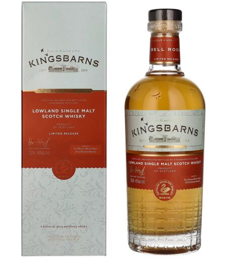 Kingsbarns Bell Rock is een karaktervolle Lowland single malt Scotch whisky van de jonge maar nu al hoog aangeschreven Kingsbarns Distillery. Gelegen aan de pittoreske oostkust van Schotland, vlakbij St Andrews, staat Kingsbarns voor traditioneel vak Kleur: Licht goud met een amberkleurige glans. Neus: Fruitig en fris met aroma's van rode bessen, honing, vanille en zachte mout. Smaak: Vol en zacht met tonen van karamel, kruiden, licht fruit en een vleugje eikenhout. Afdronk: Middellang, elegan ...