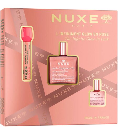 Laat je verleiden door deze bloemige combinatie voor een stralend mooie huid. Deze set combineert de perfecte verzorging voor huid en lippen, verrijkt met bloemengeuren: 1 x Huile Prodigieuse® Or Florale, 50 ml - De legendarische droge olie met een gouden glans en een bloemige geur die de huid verwent.1 x Huile Prodigieuse Florale, 10 ml - Een veelzijdige drogende olie voor huid en haar, met een delicate bloemengeur.1 x Very Rose, Lip Plumping Gloss, 8 ml - Een gloss die je lippen verwent met volume en een delicate rozengeur. Huidverzorging geformuleerd en geproduceerd in Frankrijk. Verpakking: 100% karton, 0% plastic - gemaakt in Frankrijk. Hoe te gebruiken: Huile Prodigieuse® Or Florale: Gebruik Huile Prodigieuse® Or Florale het hele jaar door, in de winter en de zomer, op gezicht, lichaam en haar. Goed schudden voor gebruik. Werk zachtjes in de huid met een platte kwast of vingertoppen, vooral op plekken die licht reflecteren: Wangen, neusbrug, voorhoofd en boven de wenkbrauwen. Breng voor het lichaam 2 tot 3 druppels aan in je handpalmen. Selecteer de zones die je wilt benadrukken en strijk ze glad met je handen. Breng een paar druppels aan in de lengten en punten van je haar voor een prachtige roségouden glans. Laat je betoveren door de delicate, omhullende geur op je huid en haar. Huile Prodigieuse Florale: Gebruik Huile Prodigieuse® het hele jaar door, in de winter en de zomer, op gezicht, lichaam en haar. Gebruik alleen op het gezicht (1 spray) of meng een paar druppels in je handpalmen met je NUXE crème. Breng aan vanuit het midden naar de gezichtscontouren. Masseer met ronddraaiende bewegingen in op het lichaam (romp, benen, enz.), vooral op zeer droge zones en/of striae. Breng een paar druppels aan op het haar en breng het naar wens aan in de lengten en punten. Laat je betoveren door de delicate, omhullende geur op je huid en haar. Very Rose Lip Plumping Gloss: Breng de gloss met de applicator aan op de lippen. Herhaal het aanbrengen naar wens gedurende de dag en geniet van de aangename, licht tintelende sensatie. ...