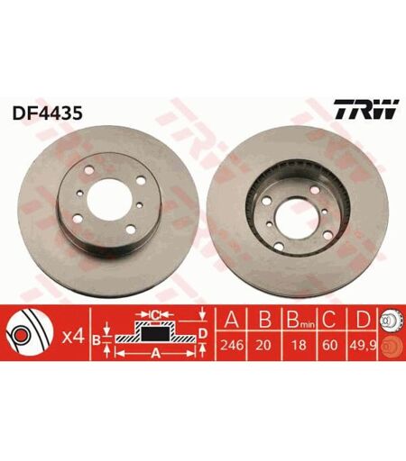 Aantal bevestigingsgaten: 4.0. Afwerking: sterk gecarboniseerd. As: Vóór. Buitendiameter [mm]: 246.0. Diameter gaten [mm]: 100.0. Diameter middengat [mm]: 60.0. Dikte [mm]: 20.0. Fabrikant: TRW. Fabrikant nr.: DF4435. Hoogte [mm]: 50.0. Index: DF4435. Minimale dikte [mm]: 18.0. Montagezijde: Links/Rechts. Oppervlak: Gelakt. Scheibe mit Lager: Niet. Type schijf: Geventileerd. ...