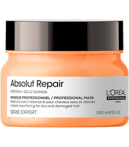Absolut Repair Mask van L'Oréal Professionnel Paris is speciaal geformuleerd voor beschadigd en droog haar. De professionele formule, verrijkt met gouden quinoa en proteïnen, helpt het haar te herstructureren en te herstellen door intensieve verzorging zonder het te verzwaren. Gestresst haar wordt gladder, glanzender en het haaroppervlak wordt hersteld. Toepassing: Aanbrengen op gewassen, handdoekdroog haar en 3 tot 5 minuten laten inwerken, grondig uitspoelen. ...
