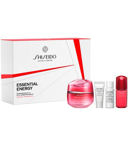 ONTHUL HET GEHEIM VAN MAXIMALE HYDRATATIE Ervaar het Age Prevention Ritual en verheug je op een frisse en vitaal uitziende huid vol uitstraling. Deze cadeauset bevat: 1 x ESSENTIAL ENERGY Hydraterende Crème, 50 ml1 x Clarifying Cleansing Foam, 5 ml1 x Treatment Softener, 7 ml1 x ULTIMUNE Power Infusing Concentrate, 10 ml ESSENTIAL ENERGY Hydrating Cream: Dankzij SHISEIDO's Original Hyaluronic Acid RED voorziet de 24-uurscrème de huid 24 uur lang intensief van vocht tot in de diepere lagen*. Het voorziet de huid continu van belangrijke voedingsstoffen en helpt haar haar vitale uitstraling en ideale vochtbalans te behouden. Ervaar een huid die van binnenuit straalt - vol energie en uitstraling. Zacht en soepel. Ideaal als make-upbasis. (*Epidermis). Clarifying Cleansing Foam: Een multifunctioneel, romig reinigingsschuim voor alle huidtypes met poederdeeltjes en witte klei die dode huidcellen, vuil en overtollig talg op milde wijze verwijdert en tegelijkertijd het ideale vochtgehalte van de huid behoudt. Voor een gladde, stralende en verfijnde teint. Bevat Japans Kirishima mineraal bronwater, rijstkiemolie en yomogi, een Japanse plantensoort (bijvoet). Dermatologisch getest. Treatment Softener: Een zachte verzachtende lotion met een lichte geltextuur die de huid onmiddellijk verfrist en langdurig hydrateert. Het verzacht zichtbaar fijne lijntjes en zorgt voor een heldere, verfijnde teint en intense glans. De verzachter bevat Japans Kirishima mineraal bronwater, Yomogi, een Japanse plantensoort (bijvoet), Lempuyang extract voor meer uitstraling, toverhazelaar extract en Mukurossi extract. Speciaal voor de normale en vette huid. Dermatologisch getest. ULTIMUNE Power Infusing Concentrate: Het nr. 1 anti-verouderingsserum van Shiseido is nu nog doeltreffender dankzij de nieuwe, dubbelwerkende anti-verouderingstechnologie met 8 plantaardige ingrediënten. Onmiddellijk na het aanbrengen ziet de huid er gladder uit en is ze optimaal gehydrateerd. Ultimune verbetert aantoonbaar en continu de conditie van de huid. Ultimune is geformuleerd met de innovatieve anti-agingtechnologie ImuGenerationRED™, die de huideigen weerstand activeert en de vitaliteit van de huid stimuleert. De verpakking van deze set is gemaakt van papier dat verantwoord bosbeheer ondersteunt (FSC®). Gebruik: STAP 1: Clarifying Cleansing Foam: Giet ongeveer 1 cm van het schuim in de palm van je hand en laat het schuimen met een beetje koud of lauw water. Reinig het gezicht en spoel daarna grondig af met water. STAP 2: Treatment Softener Verrijkt: Gebruik 's ochtends en 's avonds na het reinigen. Breng drie pompjes van de verzachter aan op een wattenschijfje en veeg zachtjes over het gezicht. STAP 3: ULTIMUNE Power Infusing Concentrate: breng Ultimune elke ochtend en avond aan na het reinigen en verzachten en vóór het hydrateren. Als je meerdere serums gebruikt, breng dan altijd eerst Ultimune aan. Doe twee pompjes in de palm van je hand en masseer zachtjes over het hele gezicht. STAP 4:... ...