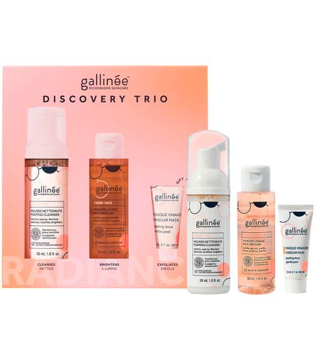 De Discovery Trio Set is een driestappenroutine met de cultproducten, geschikt voor de normale tot gevoelige huid. Schuimende reiniger 50 mlGezichtsazijn 50 mlAzijnmasker 5 ml De Foaming Cleanser is een gezichtsreinigend schuim met een unieke mix van prebiotica en melkzuur. Het reinigt mild, verzacht en verheldert de huid. 100% vindt dat de huid schoon en zuiver is*96% is het ermee eens dat het product onzuiverheden op milde wijze verwijdert zonder de huid uit te drogen* *Toepassingstest met 22 personen gedurende 28 dagen onder dermatologische controle. The Face Vinegar: hibiscusazijn en melkzuur vormen een zacht exfoliërend complex (patentnr. FR1858836) dat samen met kalmerende prebiotica zorgt voor een onmiddellijk egale teint. 100% vindt dat het product na 1 week voor een gezonde gloed zorgt*.+28% meer uitstraling na één keer aanbrengen** *Toepassingstest bij 33 mensen **Klinische evaluatie bij 33 mensen Het afwasbare azijnmasker met gelei-textuur maakt de huid stralend, soepel en gehydrateerd. 97% is het ermee eens dat het product de huid gladder maakt na één keer gebruik*90% is het ermee eens dat het product de huidstructuur verfijnt na één maand** *Toepassingstest met 31 personen **Toepassingstest met 30 personen Toepassing: 1) De Foaming Cleanser: 's Ochtends en 's avonds zachtjes inmasseren op een vochtige huid. Afspoelen en droogdeppen. 2) Gezichtsazijn: elke ochtend en avond aanbrengen op de droge huid. Breng de toner na het reinigen aan op een wattenschijfje of rechtstreeks op je vingers en verdeel het zachtjes over je gezicht en hals. 3) Azijnmasker: Breng aan op een droge huid en spoel af na 5 tot 10 minuten. Gebruik een of twee keer per week. ...