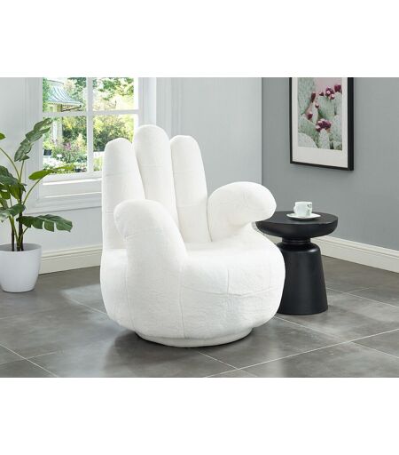 Wilt u een warme en stijlvolle sfeer in uw interieur creëren? Laat u dan verleiden door onze draaibare fauteuil CATCHY in de vorm van een hand, bekleed met weelderig kunstbont, die u uitnodigt in een cocon van zachtheid en comfort. Dankzij de draaibare poot van de fauteuil kunt u hem in een optimale stand zetten om te lezen, te praten of gewoon te ontspannen terwijl u vanuit verschillende hoeken van het uitzicht geniet. Details Kleur (tint): Wit Materiaal: Synthetisch bont Structuur: Hout Aantal plaatsen: 1 plaats Opties: Draaiende Vulling van de zitting: Polyurethaanschuim Dichtheid zitting: 25 kg/m³ Vering van de zitting: Gekruiste elastische bandjes Vulling van de rugleuning: Mousse polyuréthane Dichtheid rugleuning: 23 kg/m³ Met armleuningen Maximale belasting: 120 kg Geleverd gemonteerd (behalve poten en/of handvatten) Afmetingen Lengte: 82 cm Hoogte: 89 cm Diepte: 78 cm Zithoogte: 34 cm Zitdiepte: 51 cm Levering De levertijd van dit product zal worden bevestigd in de winkelwagen. Pakket Pakket nummer 1: Lengte 91 cm, Breedte 85 cm, Hoogte 83 cm, Gewicht 23 kg,  ...