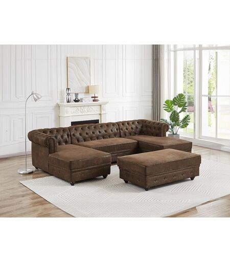 Unique Brede hoekbank en poef van microvezel met verouderd leereffect CHESTERFIELD