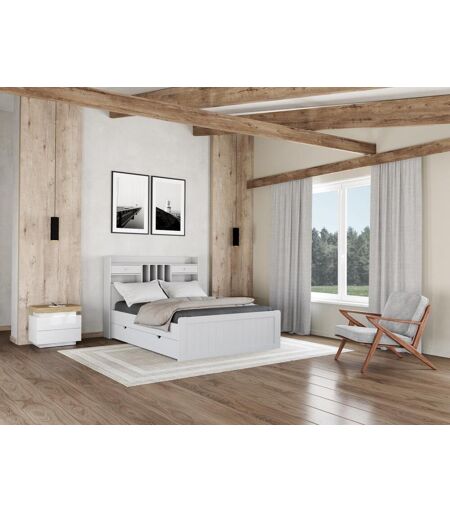 Unique Bed met opbergruimte - 140 x 190 cm - Dennenhout - Wit + Bedbodem - MEDERICK
