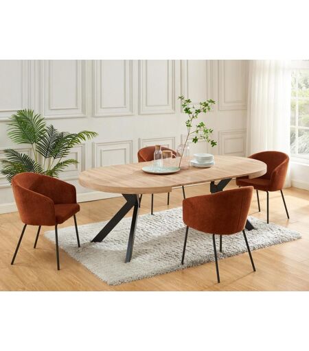 De stoel MORONI garandeert comfort en elegantie tegelijk. Hij heeft namelijk een ronde en omhullende rugleuning en een goed gevulde zitting van stof. Zijn gondelzitting past perfect bij de metalen poten, die samen een mix van strak en rond design vormen. Uitsluitend verkocht per set van 2 of 6 stoelen van dezelfde kleur.   PASCAL MORABITO Deze meubellijn is exclusief voor Vente-unique.com ontworpen door de bekende meubeldesigner PASCAL MORABITO en combineert een eigentijdse uitstraling met comfort om uw interieur mee te verfraaien. Aan de collectie zitbanken, boxspringbedden en meubels van PASCAL MORABITO wordt bijzondere aandacht besteed aan het design van de producten en inspiratie geput uit de succesvolle werken van deze Franse designer. Zijn parfum- en sieradencreaties hebben het beroemd gemaakt, met onder meer Or Noir en het gebruik van losse diamanten in zijn sieraden. Deze collectie is praktisch en is afgestemd op het dagelijks leven; ze hebben modieuze kleuren voor onaflatend plezier in uw interieur. 6 x Stoel MORONI Details Kleur (tint): Terracotta Materiaal: 100 % Polyester Materiaal (poten): Metaal Structuur: Multiplex Vulling van de zitting: Polyurethaanschuim Dichtheid zitting: 24 kg/m³ Vulling van de rugleuning: Mousse polyuréthane Dichtheid rugleuning: 20 kg/m³ Met armleuningen Gebruik: Binnen Maximale belasting: 110 kg Meubel om zelf in elkaar te zetten Afmetingen Lengte: 56.5 cm Hoogte: 79 cm Diepte: 58.5 cm Zithoogte: 48.5 cm Zitdiepte: 42.5 cm Hoogte rugleuning: 37.5 cm Levering De levertijd van dit product zal worden bevestigd in de winkelwagen. Wij raden u aan om bij de levering goed het aantal geleverde pakketten te controleren. Pakket 6 x Stoel MORONI 3 x Pakket nummer 1: Lengte 75 cm, Breedte 65 cm, Hoogte 53 cm, Gewicht 17 kg,  ...