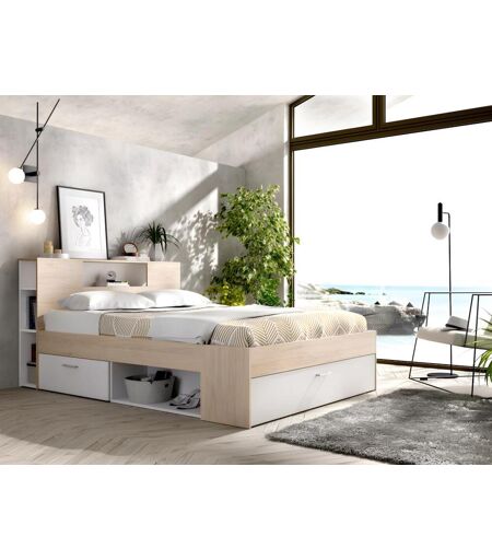 Unique Bed met hoofdeinde met opbergruimte en lades - 140 x 190 cm - Kleur: naturel en wit + bedbodem - LEANDRE