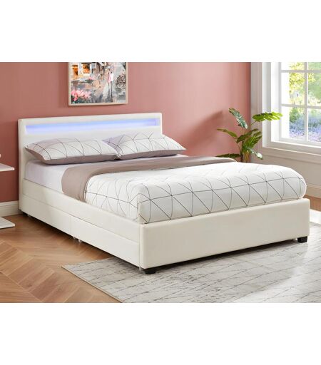 Unique Bed 160 x 200 cm met opbergruimte - Wit kunstleer met ledlampen + matras - ALOIS II