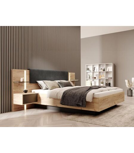 Unique Bed met nachtkastjes 160 x 200 cm - Met ledverlichting - Kleur: naturel en antraciet + bedbodem - ELYNIA