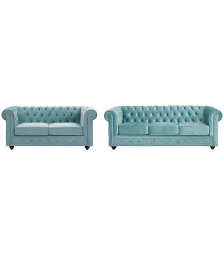 Unique Drie- en tweezitsbank van pastelblauw velours CHESTERFIELD