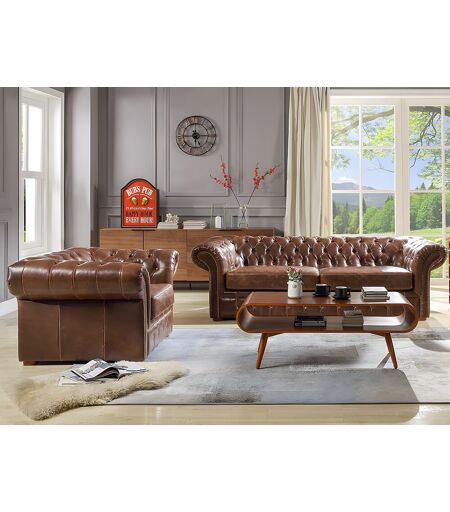 Unique Driezitsbanke en fauteuil chesterfield CLOTAIRE van 100% leer met lived-in aspect