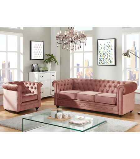Unique Driezitsbank en fauteuil CHESTERFIELD - velours - pastelroze