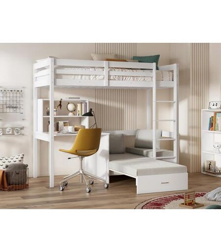 Unique Hoogslaper GOLIATH II met bureau, bedbank en opbergruimte - 90 x 200 cm - Massief grenen - Gebleekt